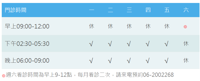 112年6月週六看診時間:6/10、6/17、6/24 早上9~12點
